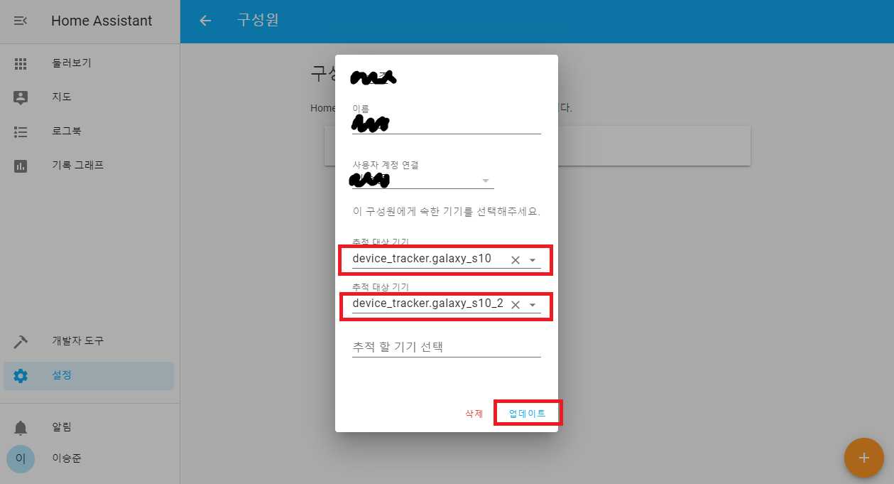 구성원 페이지에서 이름을 클릭 후 위와 같은 팝업이 뜨면 known_devices.yaml에서 찾아낸 휴대폰을 추적 대상 기기 에 설정합니다.